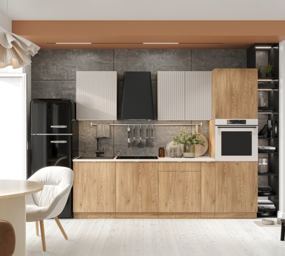 Kuchnia SOFIA tóra łączy styl, funkcjonalność i atrakcyjną cenę! Wyróżnia ją naturalność dębu na frontach szafek dolnych, a także elegancja beżu i nowoczesne ryflowanie frontów szafek górnych. Podaruj sobie kuchnię, która inspiruje – wybierz Sofię i ciesz się pięknem w każdym detalu!